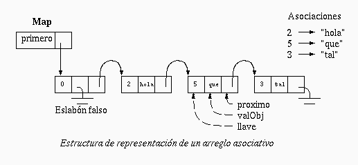 La solución a esta estructura de datos la llamaremos MAP y su implementación será mediante listas enlazadas. En la figura se observa la estructura de una arreglo asociativo que posee las asociaciones (2, "hola"), (5, "que") y (3, "tal").