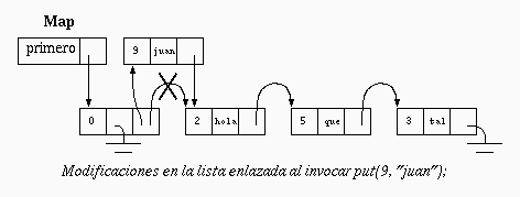 La búsqueda termina cuando se encuentra la llave especifica o cuando se acaba la lista enlazada. En este último caso el programa entrega NULL. También se necesita hacer este mismo recorrido con la operación put. Si la llave existe se modifica el valor en el mismo eslabón. Si la llave no existía previamente en la lista enlazada, se crea un nuevo eslabón para esa llave y se agrega por conveniencia justo después del eslabón falso: