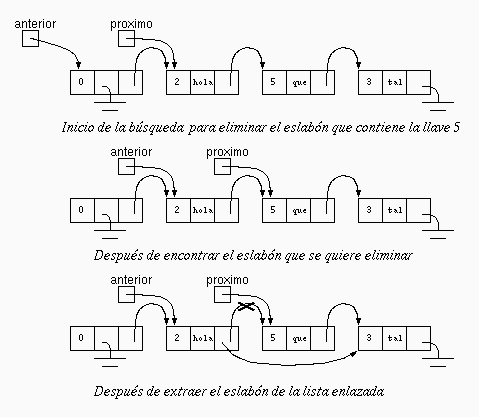Para resolver el problema, modificamos ligeramente el patrón de recorrido de modo de mantener en la variable anterior el eslabón visitado en la iteración anterior. La siguiente figura muestra cómo realizar la eliminación del eslabón utilizando la variable anterior: