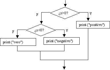 El siguiente código escribe si un número guardado en la variable x es positivo, negativo o igual a cero. A su derecha se ve su diagrama de flujo, que es una composición de dos diagramas de secuencias condicionales.
