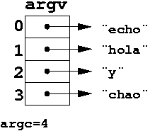 El arreglo argv tiene argc elementos, los cuales son punteros a los strings que son las palabras de la línea de comandos, comenzando por argv[0], que es el nombre del ejecutable. Por ejemplo, sea el programa echo.c escrito como:
